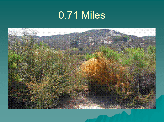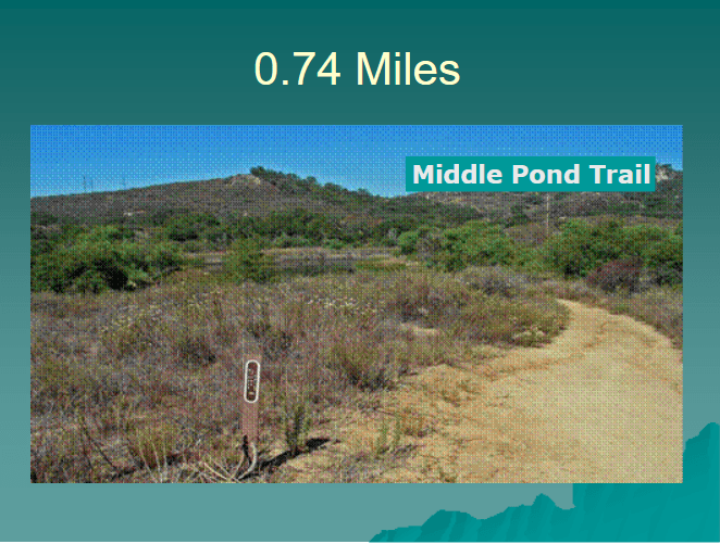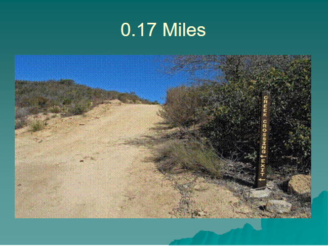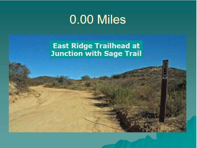 Getting to the trailhead requires a 0.83 mile hike from the entrance to Daley Ranch to the East Ridge trailhead at its junction with the Sage Trail. The first leg of this distance is 0.66 miles on the Creek Crossing Trail to its junction with East Ridge and thence a short distance (0.17 miles) on the East Ridge Trail to the Sage Trail. When we leave the trailhead we will hike from east to west repeating the 0.17 miles we covered getting to the trailhead.