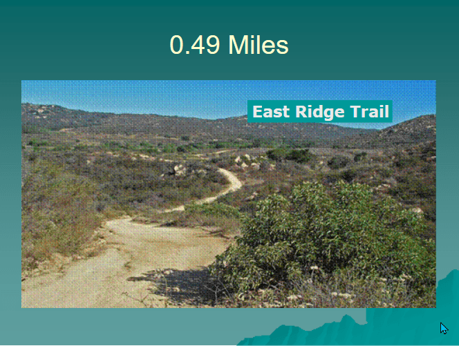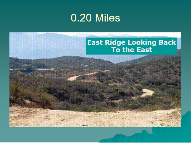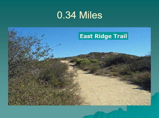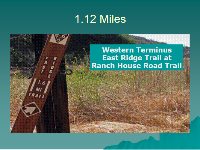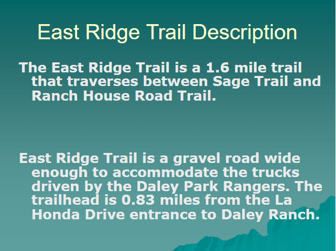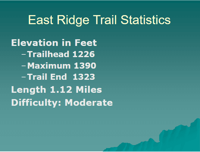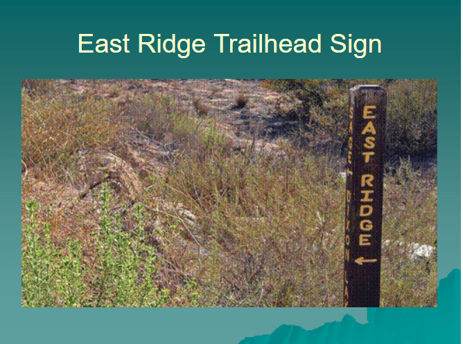 The East Ridge Trail is 1.12 miles in length and traverses between the Sage Trail on the east and the Ranch House Road Trail on the west. It is a moderately difficult hike rising from an altitude of 1,226 feet at the trailhead to 1,390 feet at its highest point.
