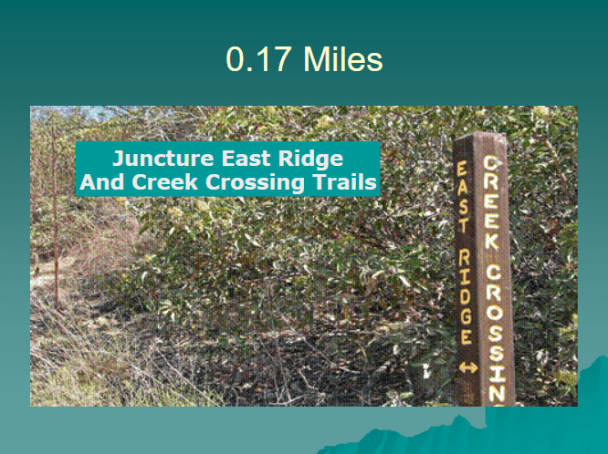 Much of the incline in the East Ridge Trail begins as one leaves the intersection of the Cross Creek and East Ridge Trails. At 0.20 miles an excellent view of the East Ridge Trail can be gotten by looking over ones shoulder. The trail cuts a winding path from here to its trailhead at the Sage Trail.