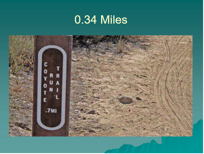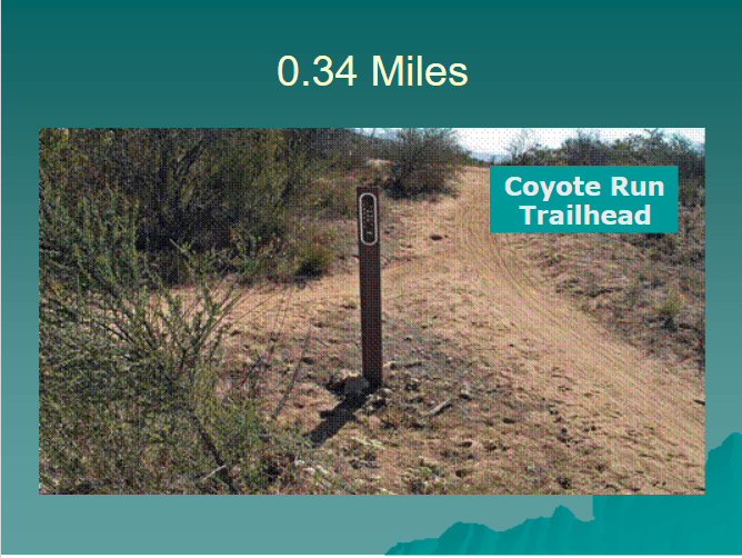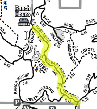 The southern trailhead for the Coyote Run Trail is 0.34 miles from the East Ridge trailhead. It is 0.7 miles in length spanning the distance between East Ridge and the Sage Trail. Along the way the Diamond Back Trail branches off to the left.